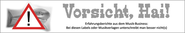 In diesem Blog finden sich Erfahrungsberichte von Musikern mit besonders unseriösen Labels, bzw. Musikverlagen. Aufgrund der vorwiegend durch das Internet bedingten Veränderung des Musik-Business werden leider immer häufiger negative Erfahrungen gemacht. Bands schießen heutzutage nur so aus dem Boden und haben unlängst einen mehr oder weniger neuen Markt erschlossen - einen Markt, der auf Täuschung und Betrug basiert.